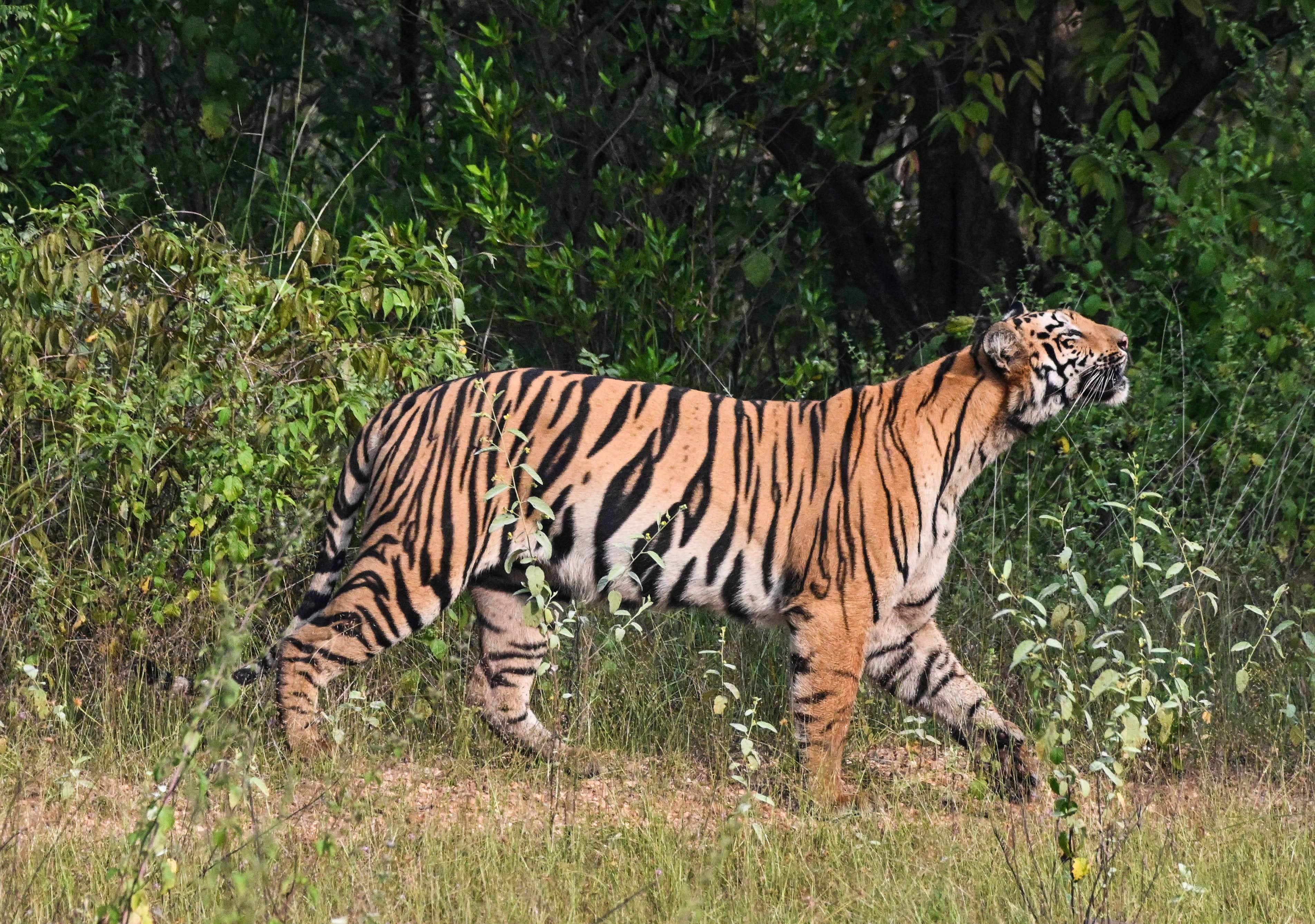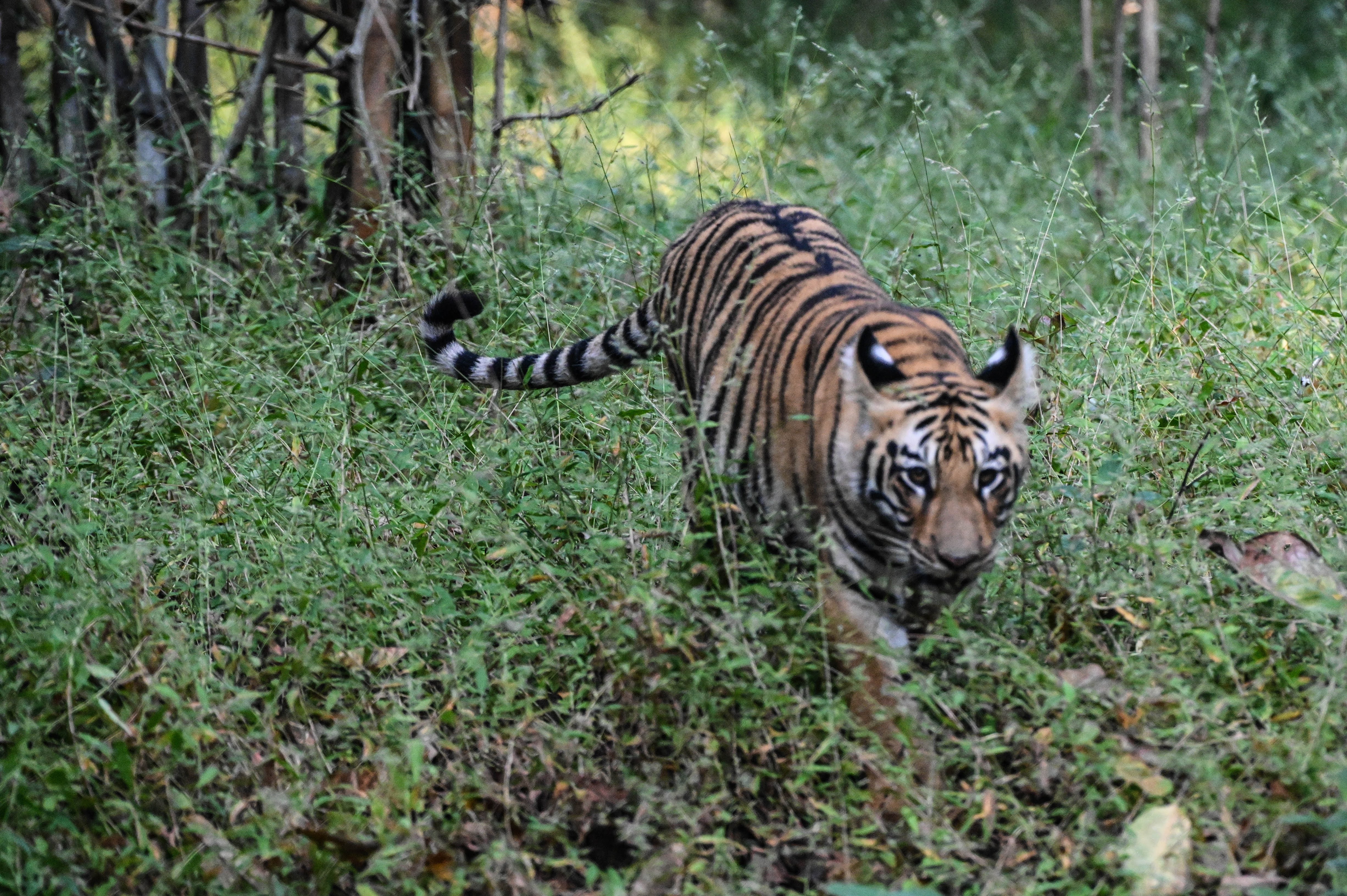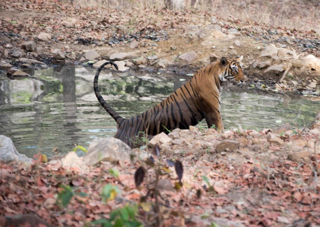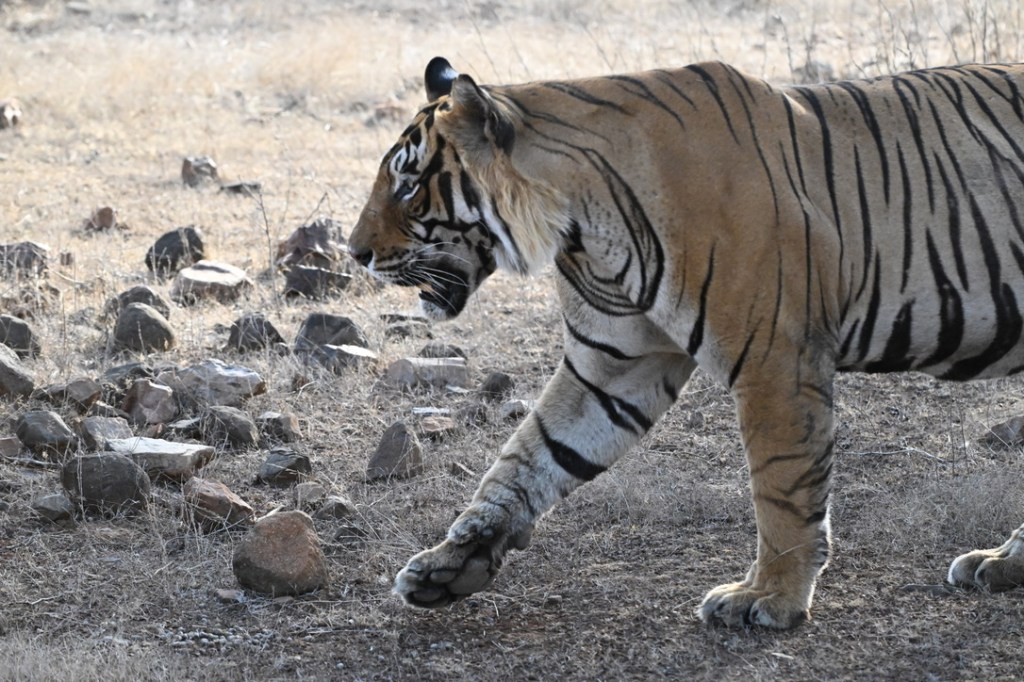 We spent a significant time with these cubs before decide to go off the road and head to the lake. As we made our way towards the lake, we were expecting to see Riddhi with her cubs in some time. We were in for a surprise, though. There was Arrowhead walking towards us along the lake’s shoreline. Unexpected, because Arrowhead is Riddhi’s mother, has 3 more cubs of her own and is not expected to be so close to Riddhi’s territory. Arrowhead continued to walk into the grass before she walked on the thin strip of land to the structure in the middle of the lake. As she rested there, we made our way back towards the gate to see Riddhi’s male cub walking in the grass next to the jeep path and then sitting in the grsss looking us directly in the eye. Heading back to the lake, we saw a tiger sitting across the lake. This had to be one of Arrowhead’s cubs. Scanning the shoreline, we saw two more cubs sitting under a tree close by. As we deliberated our next move, Arrowhead had decided to resume her slow walk, this time towards her cubs. We headed in the direction of the cubs passing by the beautiful Malik Lake. We were now close to the cubs. We spent time watching and following the cubs before we decided to move along and head back to Riddhi’s cubs. We were on way when we saw Riddhi walking alone. We now were following Riddhi before she decided to leave the road and move further into the forest. We made our way to the gate after an afternoon of non stop tiger sighting. Our afternoon was not going to end without a twist. As we made our way towards the hotel, Sultana was walking on the rocks next to the main road. She soon disappeared from our view into Zone 2 and we headed back to our hotel just couldn’t believe that we had spent an entire afternoon with tigers.